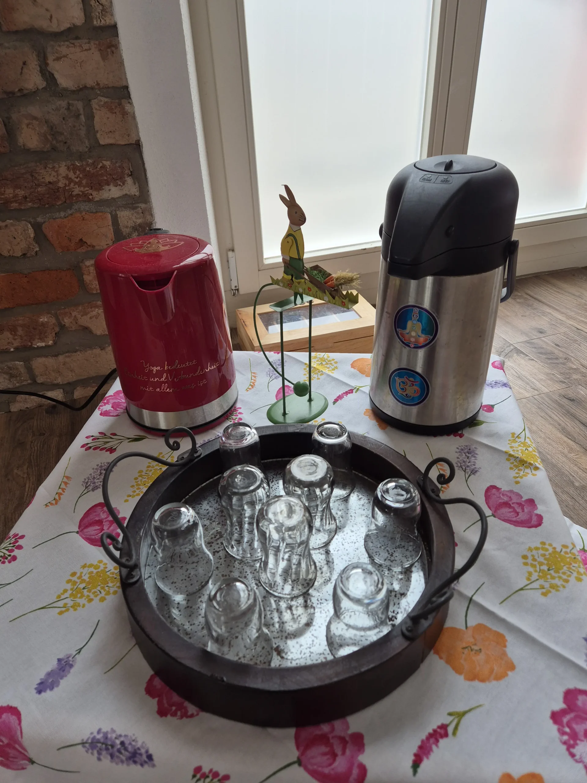 Diesen einzigartigen Moment, der sich gerade so wie er eben ist und für uns erlebbar ist, genießen. Wir entwickeln dabei Konzentration, Ruhe und Gelassenheit, einfach nur, indem wir mit Freundlichkeit wahrnehmen und ganz beider Sache sind. Wir können z.B.: den Mantel und die Schuhe beim An- und Ausziehen spüren, ganz genau. Auch die Bewegungen. Beim Gehen die Fußsohlen und die Bewegung des Körpers spüren, wenn wir einen kleinen Weg von unserem Platz durch den Raum zur Tür zurücklegen. Die Türklinke spüren. Den Teebeutel, die Tasse in der Hand, das heiße Wasser, wie es über den Beutel in die Tasse strömt, das Hinsetzen, das Werden des Tees, die Wärme, den Duft, den Geschmack…